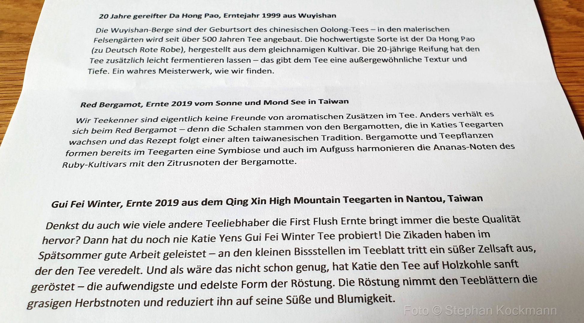 Die auf einem Informationsblatt mitgelieferten Beschreibungen der Tees aus der Winter-Box klingen sehr vielversprechend: