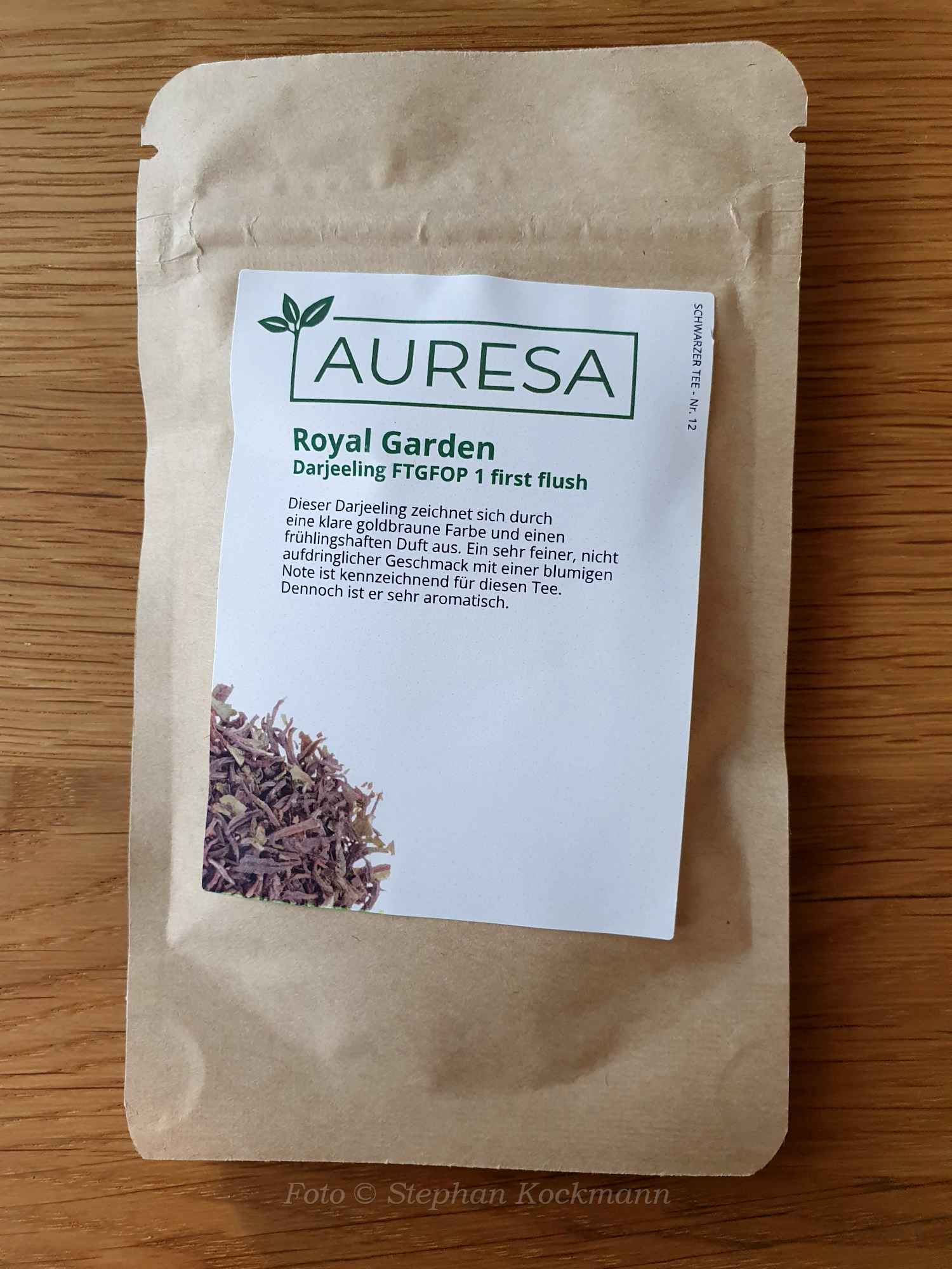 Die Teeproben sind alle in den üblichen Zip-Lock-Verpackungen aus Kraftpapier luft-, licht- und aromadicht verpackt. Da AURESA auf Nachhaltigkeit setzt, werden die normalen Teegebinde auch in Teegläsern mit Korkverschluss angeboten. Sämtliche Verpackungen sind recyclebar oder wieder verwertbar.