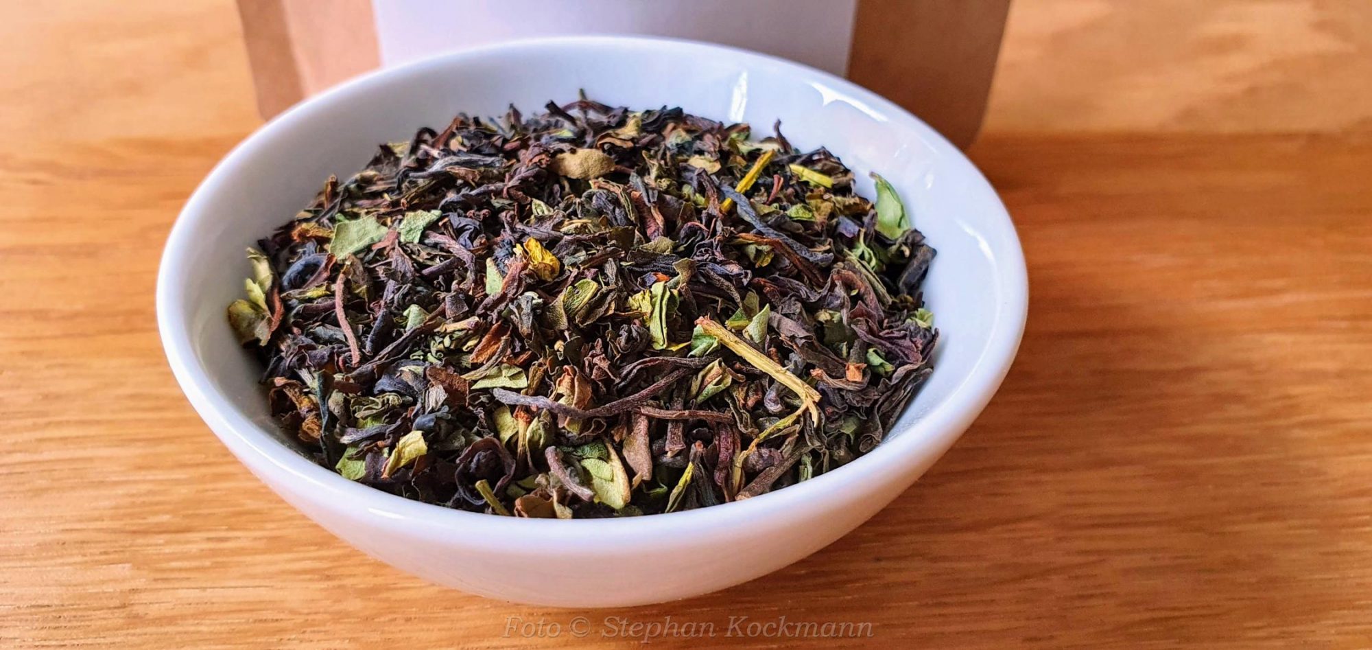 Das Etikett weist zwar die Ernte 2020 aus, aber laut Beschreibung und Info im Shop ist es ein erntefrischer Darjeeling aus dem Jahr 2021. Auch hier zeigt sich ein wunderschönes Farbenspiel im trockenen Blatt.